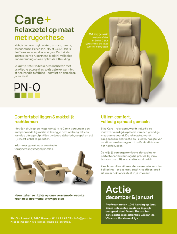 Each Care+ relax chair Parkinson’s chair is handcrafted in Belgium, in the company’s own workshop. Quality and follow-up care are taken seriously: